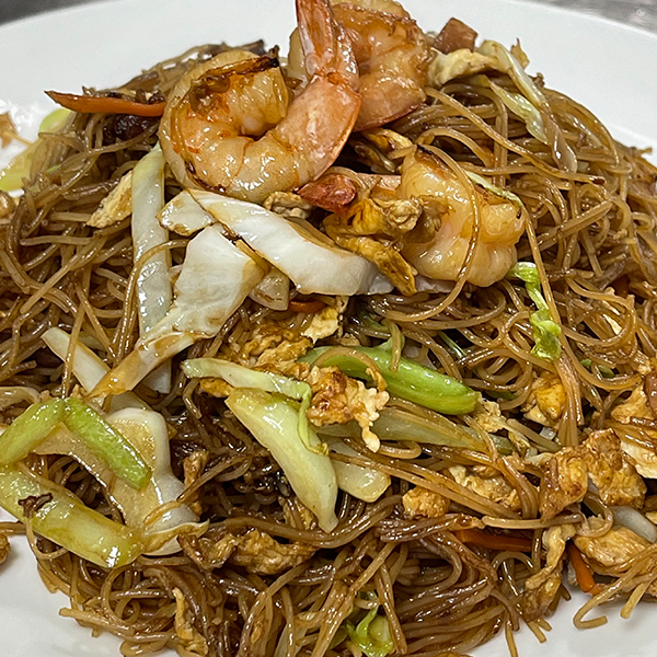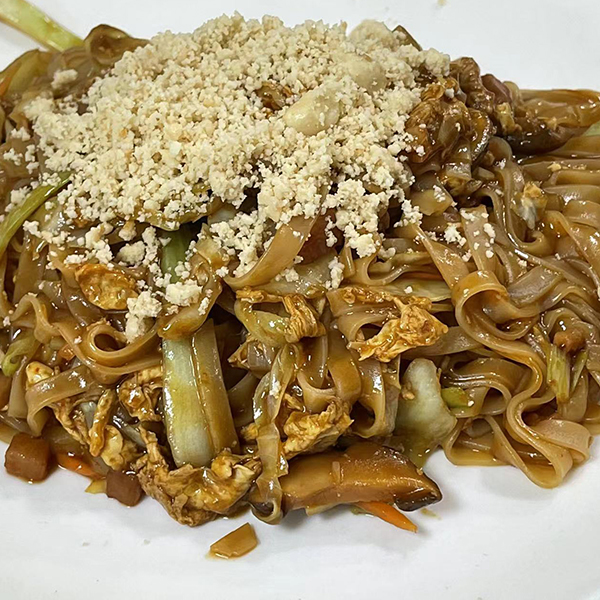 Tallarines de arroz, huevo, langostinos, verduras, tofu, cacahuete, lima y salsa tamarindo