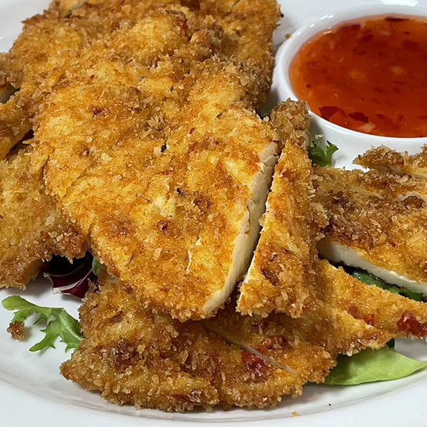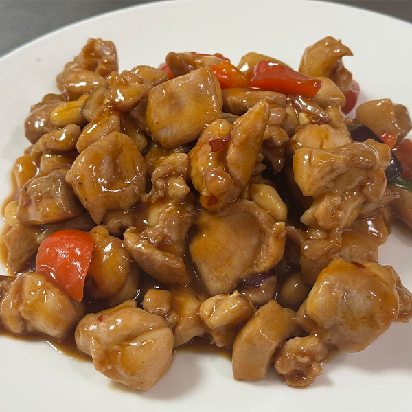 Ternera crujiente y agridulce de chili suave (picante). Contiene alérgenos: gluten, soja.